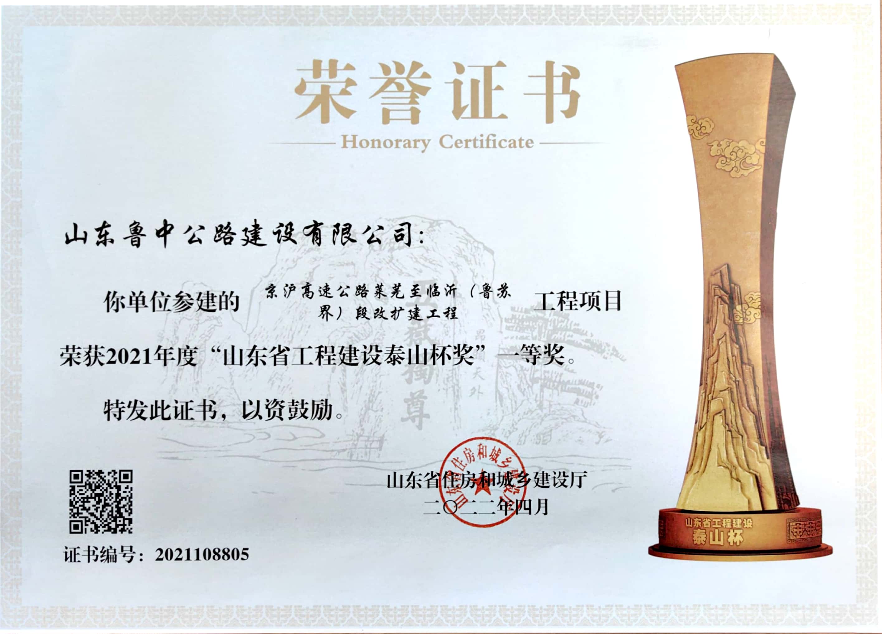 - 京沪高速公路莱芜至临沂(鲁苏界)段改扩建工程荣获2021年度“山东省工程建设泰山杯奖“一等奖”